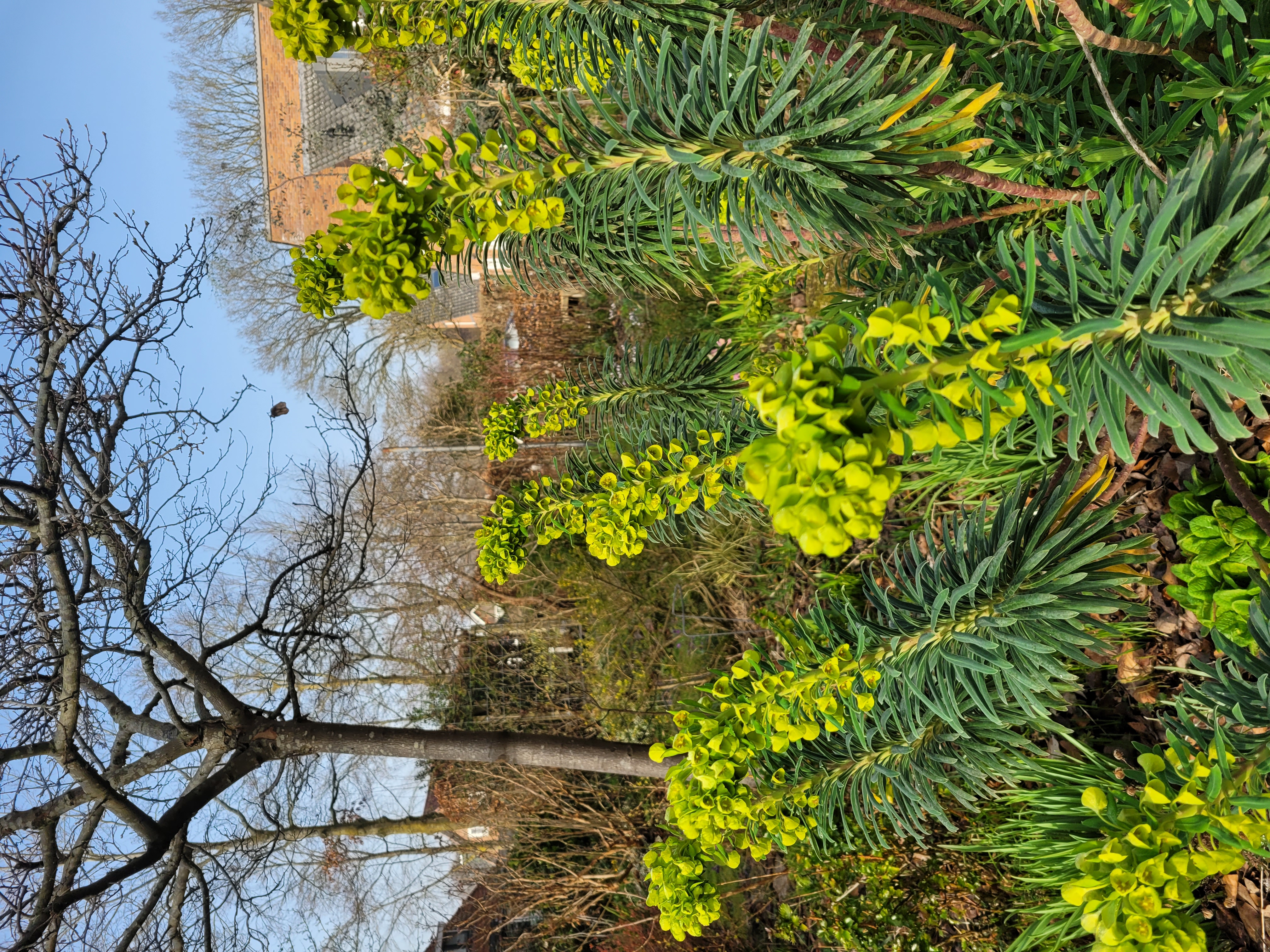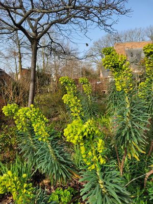 Er zijn een paar duizend soorten wolfsmelk. De hoge Euphorbia characias bloeit nu en gaat daar lang mee door. Beschut tegen de wind, op een zonnige, goed gedraineerde droge plek heb je er jaren plezier van. Veel wolfsmelk soorten zijn wintergroen en hebben groen gelige bloemen, maar Euphorbia griffithii “Fire Glow” of “Dixter” hebben vrolijk oranje bloemen, maar verliezen wel hun blad in de winter. De lentebloeiende Euphorbia “Blackbird” is wintergroen , hoewel groen? Het blad is donkerpaars en dat contrasteert mooi met de bloemen. De plant kan in de zon of half schaduw staan.