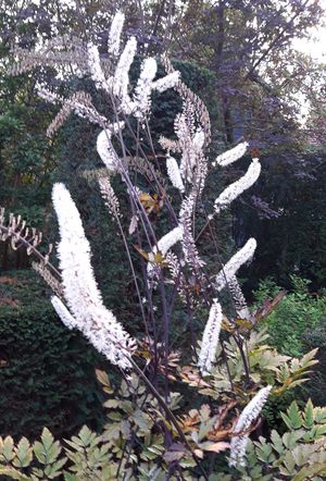 Een andere laatbloeier waar ik in deze column eens de aandacht op wil vestigen, is de Cimacifuga, ofwel zilverkaars, overigens recentelijk omgedoopt tot Actaea. Er is zowel een groenbladige als een roodbladige variant, maar beide hebben gemeen dat ze op een hoogte van 1,50-2.00 meter aren vormen die eind september/begin oktober als zilverwitte kaarsen in bloei komen (zie foto). En dat is nog niet alles, ze verspreiden dan ook nog eens een intense zoete geur, die zelfs op een afstand van enkele meters niet te missen is.